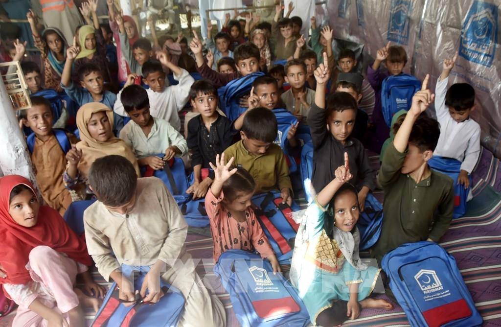 Ngày 20/9/2022, Bộ trưởng Kế hoạch Pakistan Ahsan Iqbal cảnh báo nguy cơ các bệnh lây truyền qua đường nước vượt ngoài tầm kiểm soát sau thảm họa lũ lụt ở nước này. Trong ảnh: Lớp học dã chiến dành cho trẻ em đi sơ tán tránh lũ lụt tại Charsadda, Pakistan, ngày 21/9/2022. Ảnh: THX/ TTXVN