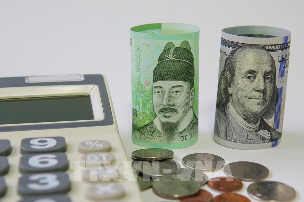 Tỷ giá của nhiều đồng tiền lớn so với đồng USD đã đồng loạt giảm xuống mức thấp nhất trong nhiều năm sau khi Cục Dự trữ liên bang Mỹ (Fed) quyết định tăng lãi suất ở mức 0,75 điểm % ngày 21/9/2022. Đồng nội tệ của Hàn Quốc đã lần đầu tiên trong hơn 13 năm giảm xuống dưới mốc 1.400 won đổi được 1 USD. Trong ảnh: Đồng won (trái) của Hàn Quốc và đồng đô la Mỹ tại Seoul ngày 22/9/2022. Ảnh: THX/ TTXVN