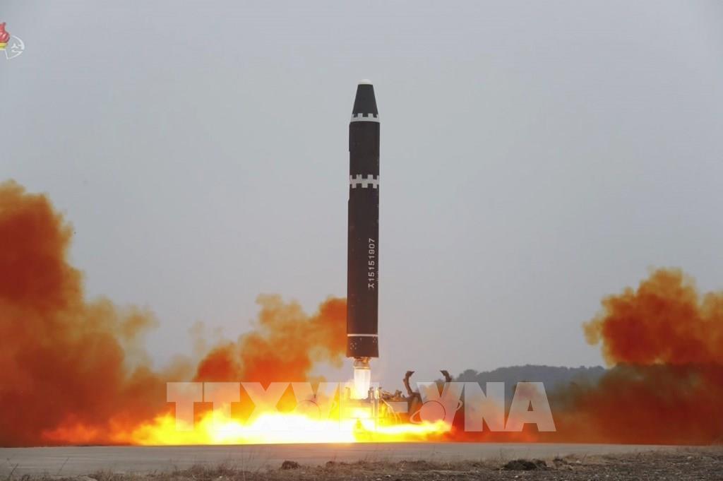 Hãng thông tấn Trung ương Triều Tiên (KCNA) ngày 23/2/2023 xác nhận nước này đã tiến hành phóng thử nhiều tên lửa đạn đạo trong những ngày qua, trong đó có vụ phóng thành công tên lửa hành trình chiến lược Hwasal-2 và tên lửa liên lục địa (ICBM) Hwasongpho-15 (ảnh). Các vụ phóng này nằm trong khuôn khổ cuộc diễn tập năng lực sẵn sàng chiến đấu trong tình trạng khẩn cấp, đồng thời đáp trả các cuộc tập trận chung Mỹ-Nhật-Hàn. Ảnh: YONHAP/TTXVN