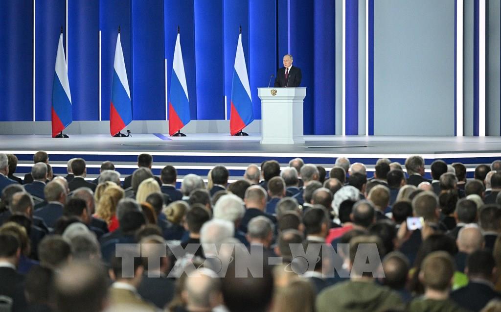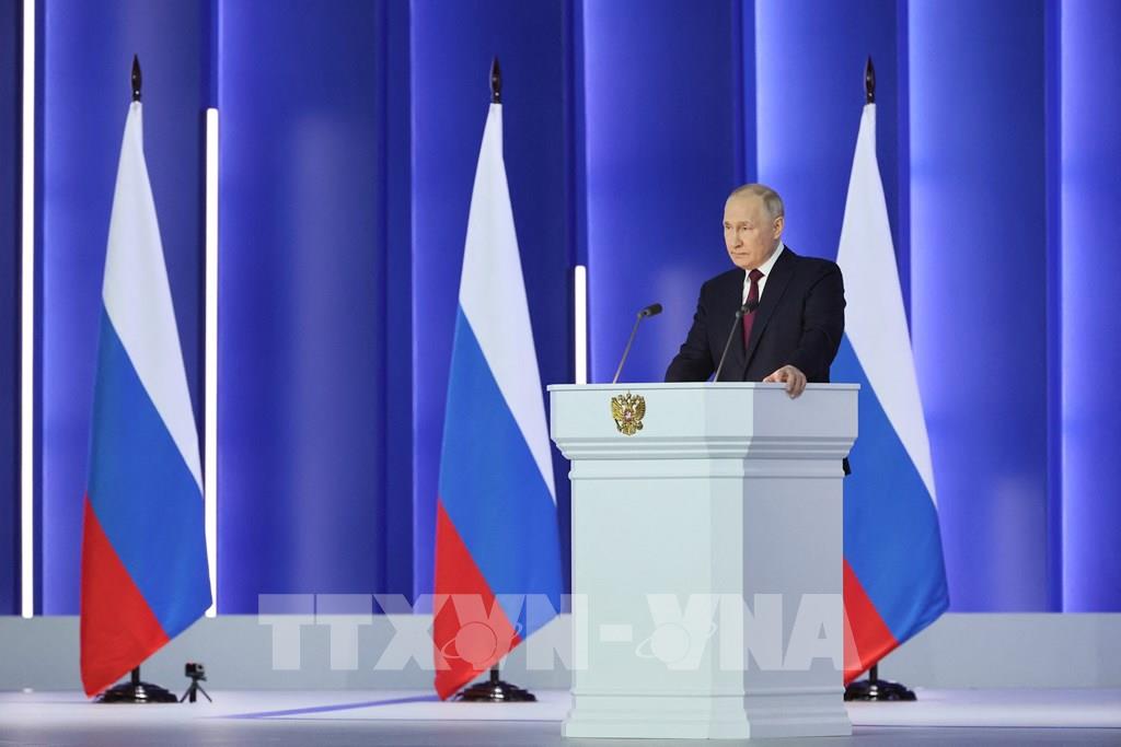Ngày 21/2/2023, Tổng thống Nga Vladimir Putin đã trình bày Thông điệp liên bang trước Quốc hội nước này, trong đó đề cập đến tiến trình của chiến dịch quân sự đặc biệt ở Ukraine, tình hình quốc tế cũng như các vấn đề kinh tế và xã hội của LB Nga. Ảnh: AFP/TTXVN
