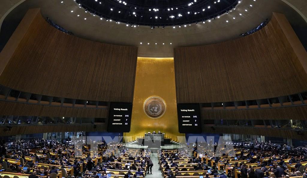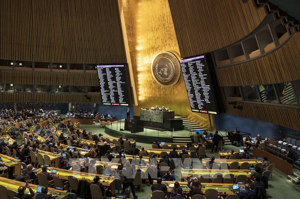 Ngày 23/2/2023, tại phiên họp đặc biệt ở New York (Mỹ) nhân sự kiện tròn một năm Nga mở chiến dịch quân sự đặc biệt tại Ukraine, Đại hội đồng LHQ đã thông qua nghị quyết kêu gọi chấm dứt ngay lập tức cuộc xung đột Nga-Ukraine. Sau 1 năm, Moskva và Kiev vẫn chưa thể ngồi vào bàn đàm phán, thậm chí có thêm nhiều ngòi nổ mới với các động thái can thiệp quân sự của đồng minh hai phía, tiếp tục là biến số gây quan ngại cho triển vọng thế giới năm 2023. Ảnh: AFP/TTXVN