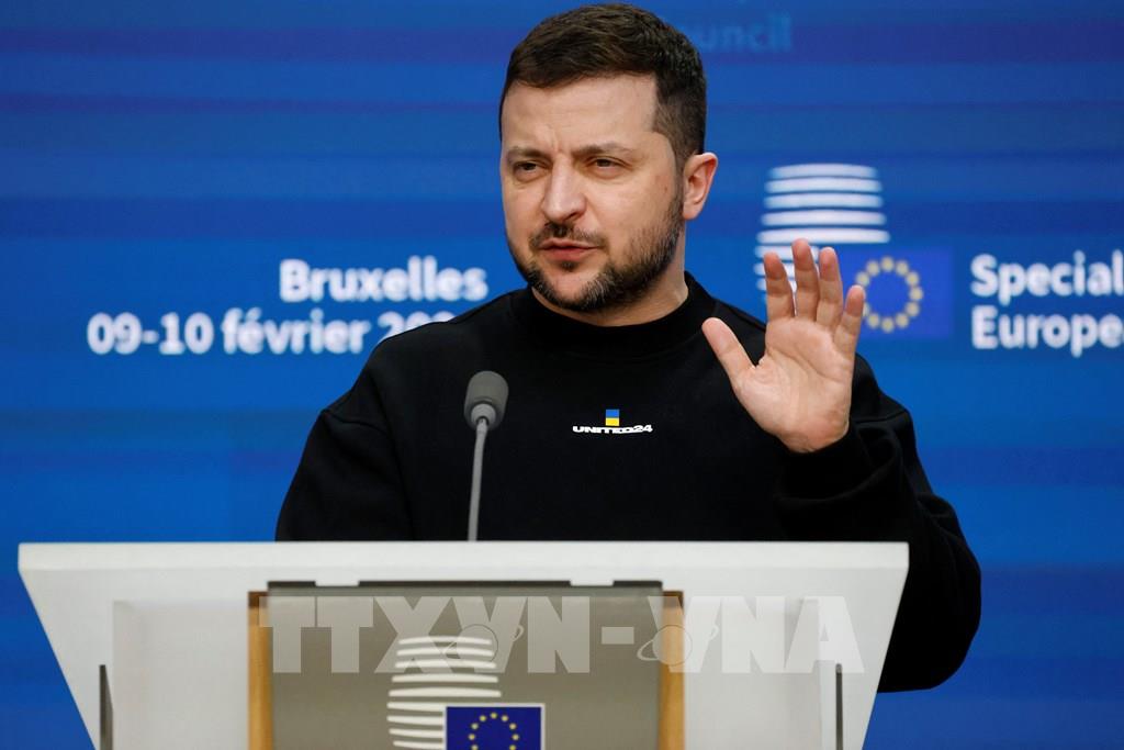 Hội nghị thượng đỉnh đặc biệt của Liên minh châu Âu (EU) diễn ra ngày 9-10/2 tại thủ đô Brussels của Bỉ thảo luận về vấn đề Ukraine, phản ứng của châu Âu trước các chương trình trợ cấp của Mỹ và vấn đề di cư. Ảnh: Tổng thống Ukraine Volodymyr Zelensky phát biểu tại hội nghị ngày 9/2/2023. Ảnh: AFP/TTXVN