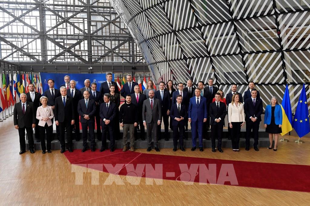 Hội nghị thượng đỉnh đặc biệt của Liên minh châu Âu (EU) diễn ra ngày 9-10/2 tại thủ đô Brussels của Bỉ thảo luận về vấn đề Ukraine, phản ứng của châu Âu trước các chương trình trợ cấp của Mỹ và vấn đề di cư. Ảnh: Các đại biểu chụp ảnh chung tại hội nghị ngày 9/2/2023. Ảnh: AFP/TTXVN