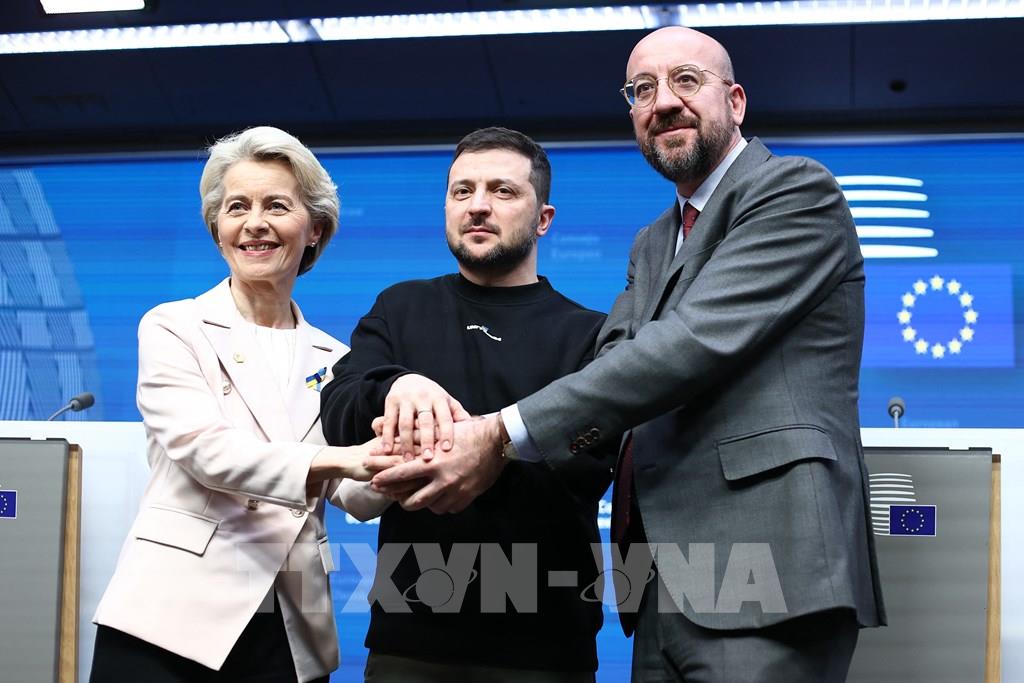 Hội nghị thượng đỉnh đặc biệt của Liên minh châu Âu (EU) diễn ra ngày 9-10/2 tại thủ đô Brussels của Bỉ thảo luận về vấn đề Ukraine, phản ứng của châu Âu trước các chương trình trợ cấp của Mỹ và vấn đề di cư. Ảnh (từ trái sang): Chủ tịch Ủy ban châu Âu Ursula von der Leyen, Tổng thống Ukraine Volodymyr Zelensky và Chủ tịch Hội đồng châu Âu Charles Michel tại cuộc họp báo trong khuôn khổ hội nghị ngày 9/2/2023. Ảnh: AFP/TTXVN