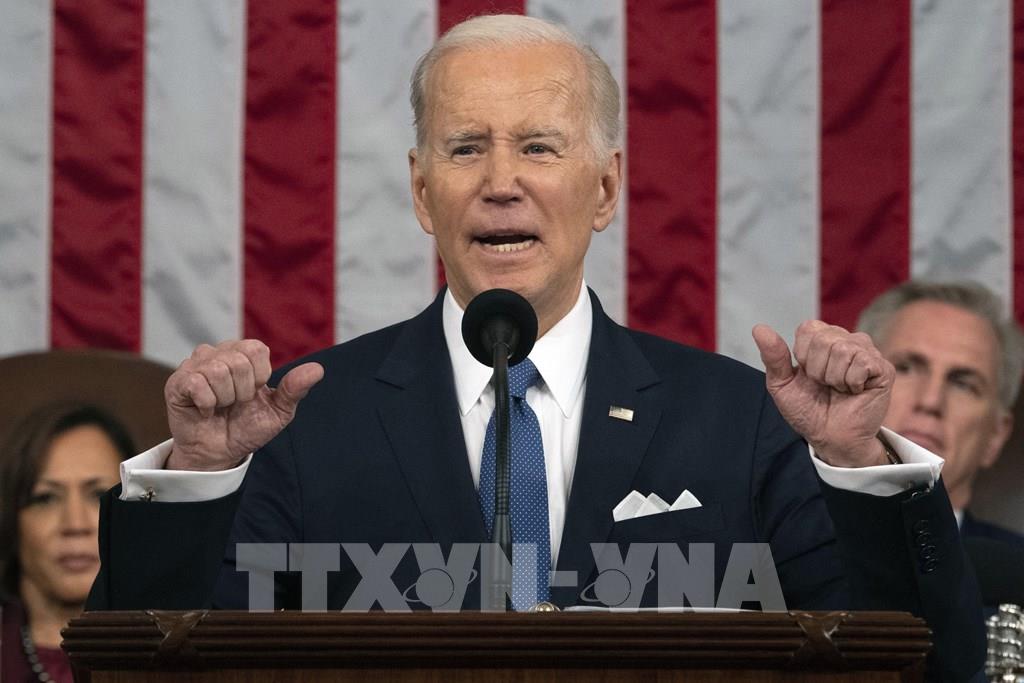Sáng 8/2/2023 (giờ Việt Nam), Tổng thống Mỹ Joe Biden đã trình bày Thông điệp liên bang trước lưỡng viện Quốc hội, đề cập đến các vấn đề đối nội và đối ngoại như kinh tế, cải tổ lực lượng cảnh sát, quan hệ với phe Cộng hòa, Trung Quốc và Ukraine,... Ảnh: AFP/TTXVN