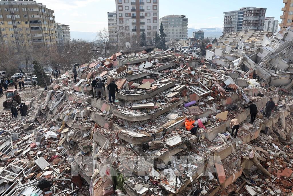 Ngày 6/2/2023, trận động đất kinh hoàng độ lớn 7,8 đã xảy ra ở khu vực biên giới giữa Thổ Nhĩ Kỳ và Syria. Tính đến 4h03' ngày 10/2 (giờ Việt Nam), số người thiệt mạng trong thảm họa động đất này đã lên tới hơn 21.000 người, trong khi hàng nghìn ngôi nhà ở hai bên biên giới bị phá hủy. Ảnh: Cảnh hoang tàn sau trận động đất tại Kahramanmaras, Thổ Nhĩ Kỳ ngày 7/2/2023. Ảnh: AFP/TTXVN