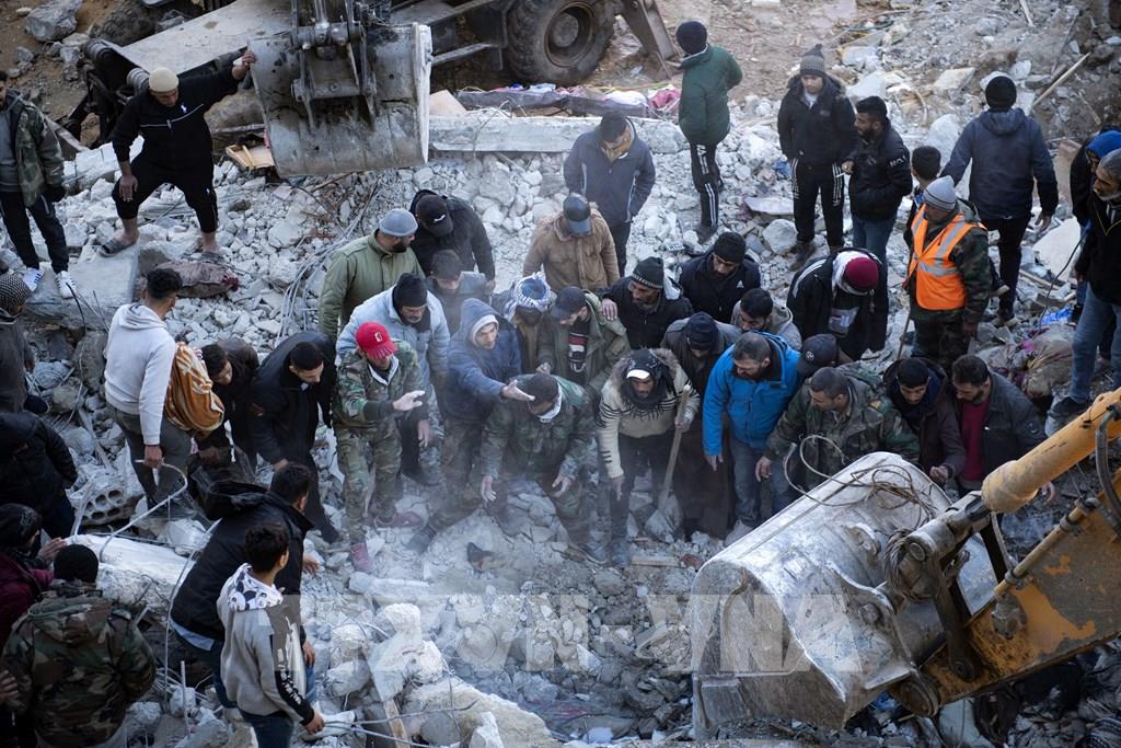 Ngày 6/2/2023, trận động đất kinh hoàng độ lớn 7,8 đã xảy ra ở khu vực biên giới giữa Thổ Nhĩ Kỳ và Syria. Tính đến 4h03' ngày 10/2 (giờ Việt Nam), số người thiệt mạng trong thảm họa động đất này đã lên tới hơn 21.000 người, trong khi hàng nghìn ngôi nhà ở hai bên biên giới bị phá hủy. Ảnh: Người dân và lực lượng cứu hộ tìm kiếm nạn nhân dưới đống đổ nát sau trận động đất tại Latakia, Syria ngày 8/2/2023. Ảnh: AFP/TTXVN