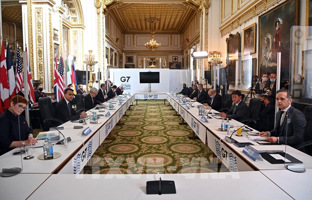 Hội nghị Ngoại trưởng Nhóm các nước công nghiệp phát triển hàng đầu thế giới (G7) tại London (Anh) ra tuyên bố chung ngày 5/5/2021, tập trung đối phó với dịch COVID-19 và kế hoạch phục hồi sau dịch, chương trình hạt nhân Triều Tiên, cuộc khủng hoảng Syria, cuộc chiến chống biến đổi khí hậu và nỗ lực khôi phục thỏa thuận hạt nhân Iran. Trong ảnh: Toàn cảnh hội nghị. Ảnh: AFP/ TTXVN