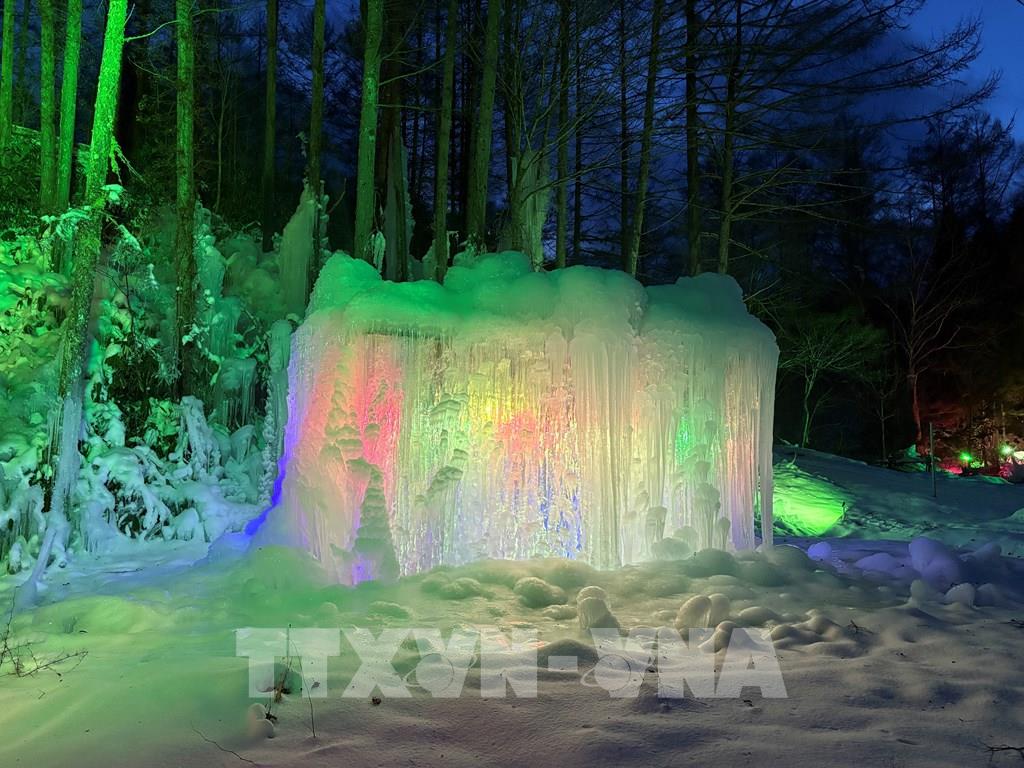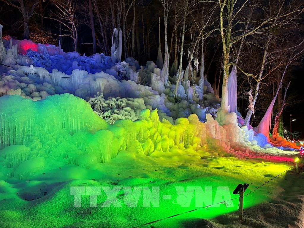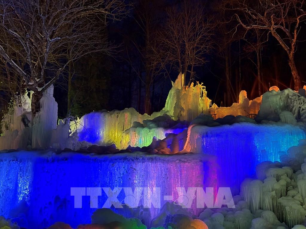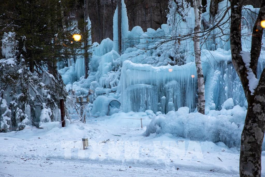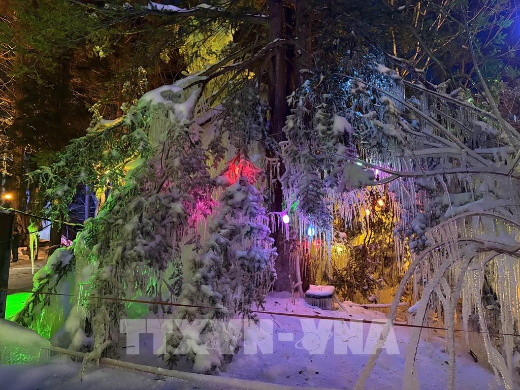 Mỗi mùa Đông, nước được phun liên tục lên cây cối, khung gỗ, sau đó đóng băng tự nhiên thành những cột băng, thác băng và mảng băng treo lấp lánh. Ảnh: Xuân Giao – PV TTXVN