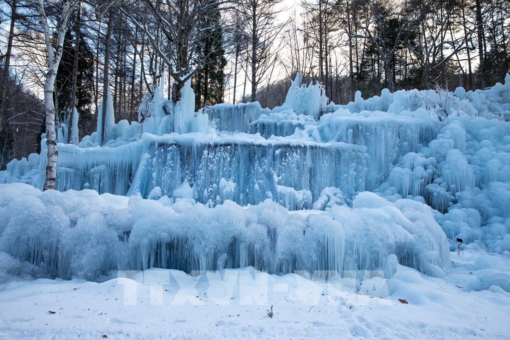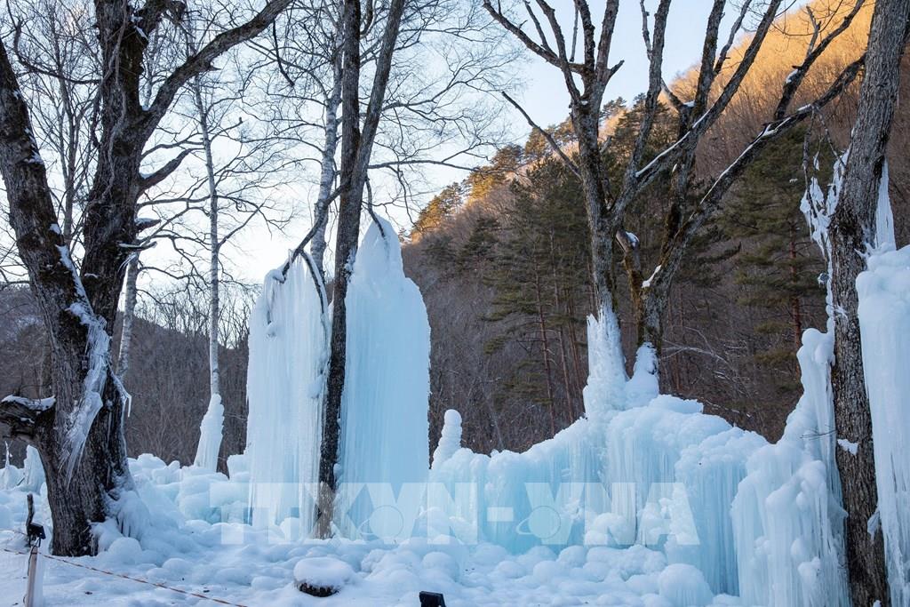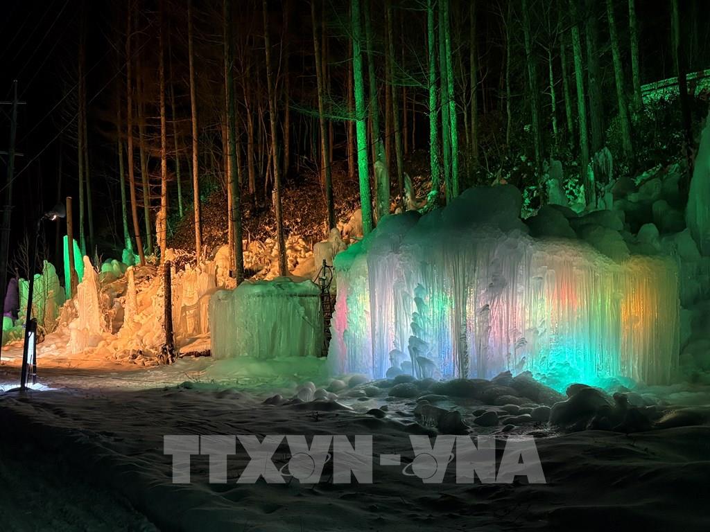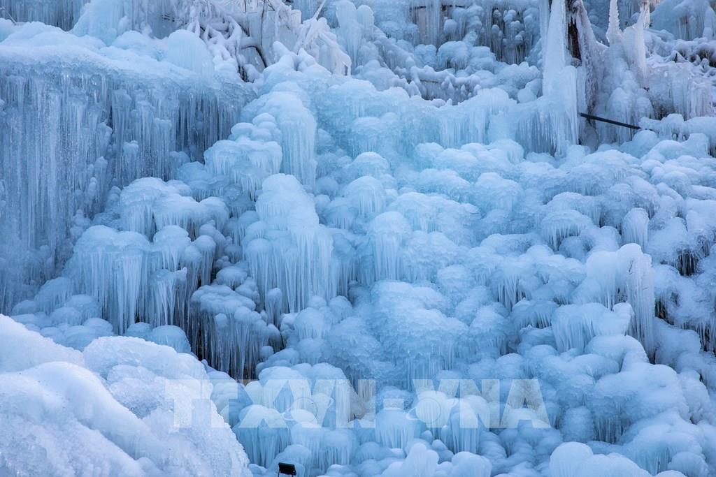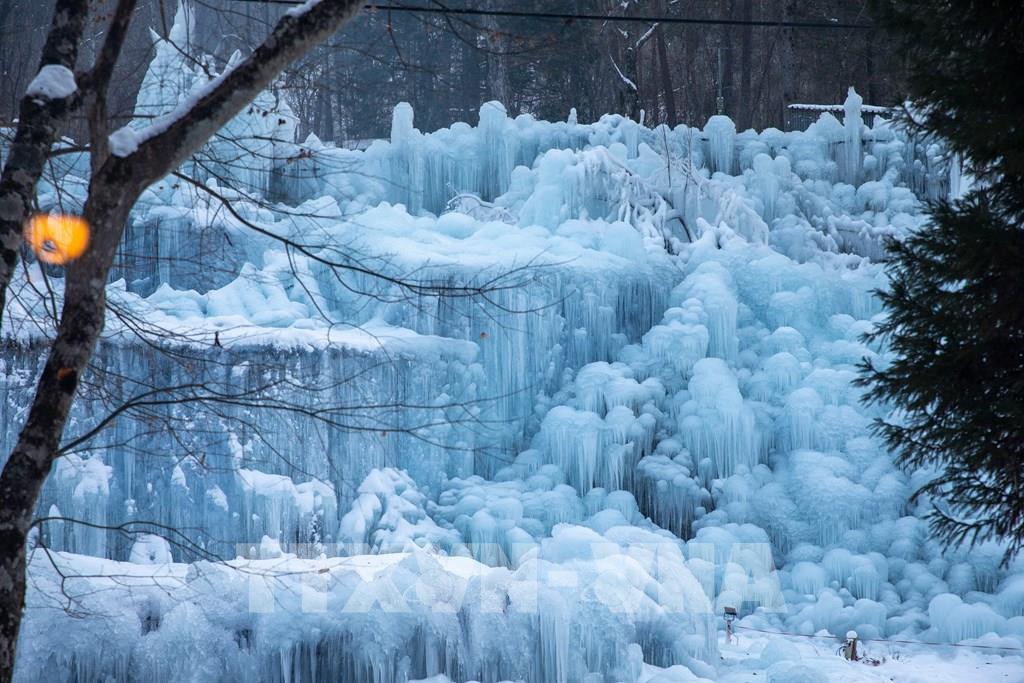 Mỗi mùa Đông, nước được phun liên tục lên cây cối, khung gỗ, sau đó đóng băng tự nhiên thành những cột băng, thác băng và mảng băng treo lấp lánh. Ảnh: Xuân Giao – PV TTXVN