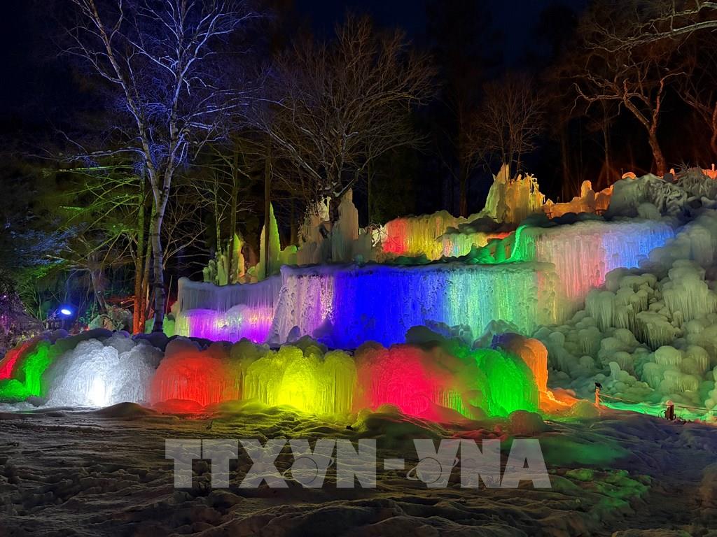 Hệ thống đèn LED nhiều màu chiếu sáng các khối băng, tạo nên không gian huyền ảo, vừa siêu thực vừa lãng mạn. Ảnh: Xuân Giao – PV TTXVN
