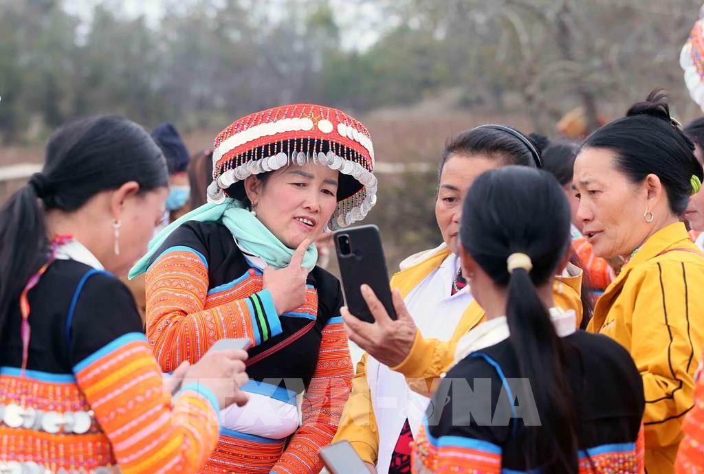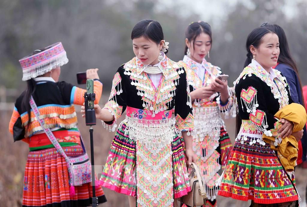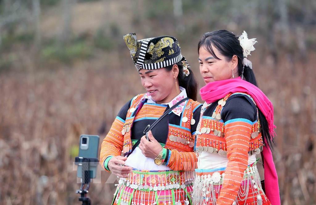 Phụ nữ dân tộc Mông xã Hua Nhàn, huyện Bắc Yên, xúng xính váy áo, vui Xuân đón Tết. Ảnh: Quang Quyết - TTXVN