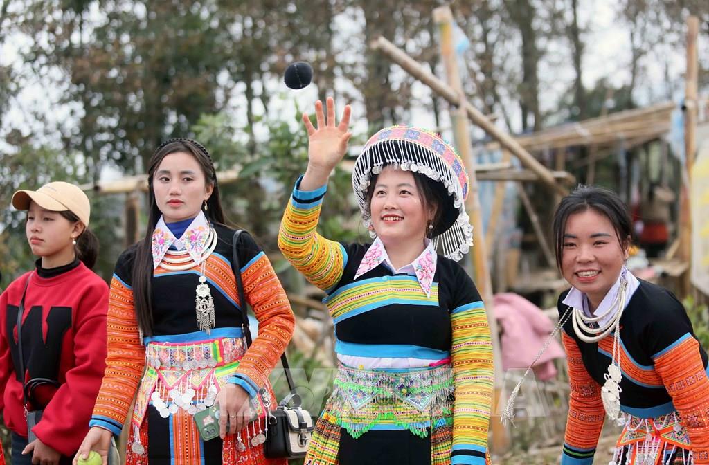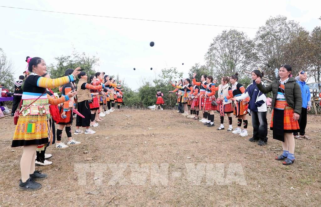 Các chàng trai, cô gái dân tộc Mông xã Hua Nhàn, huyện Bắc Yên tham gia ném Pao. Ảnh: Quang Quyết - TTXVN