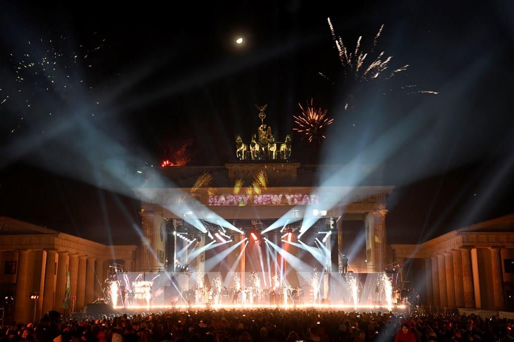 Màn trình diễn đón Năm mới tại Cổng Brandenburg ở Berlin, Đức, ngày 1/1/2023. Ảnh: AFP/ TTXVN