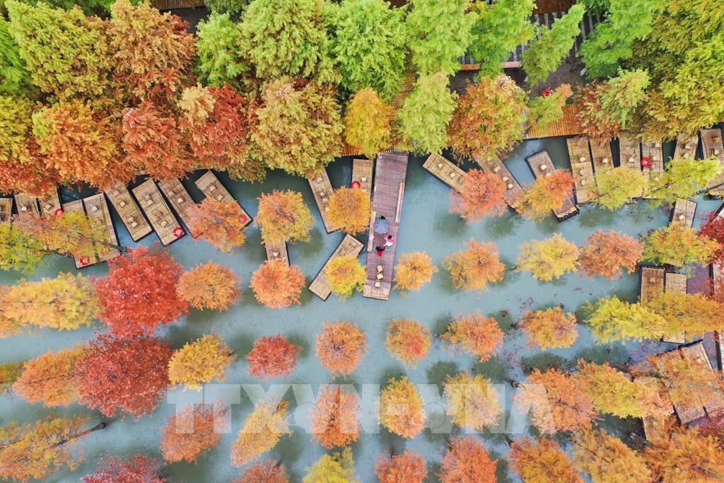 Những tán lá chuyển màu vàng và đỏ khi thu sang, tại tỉnh Giang Tô, Trung Quốc, ngày 26/10/2022. Ảnh: THX/ TTXVN