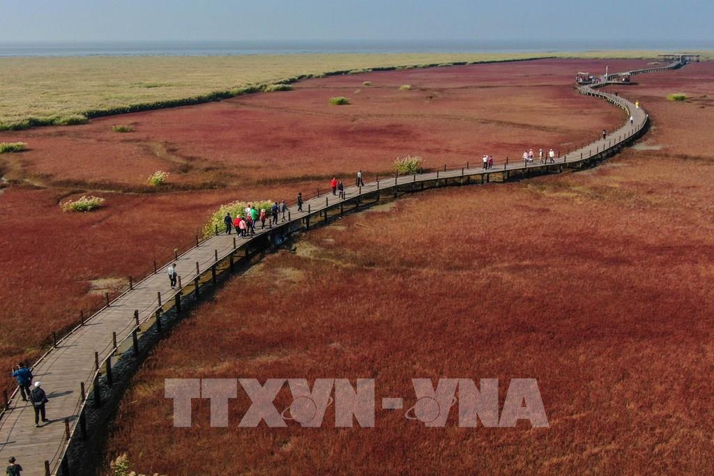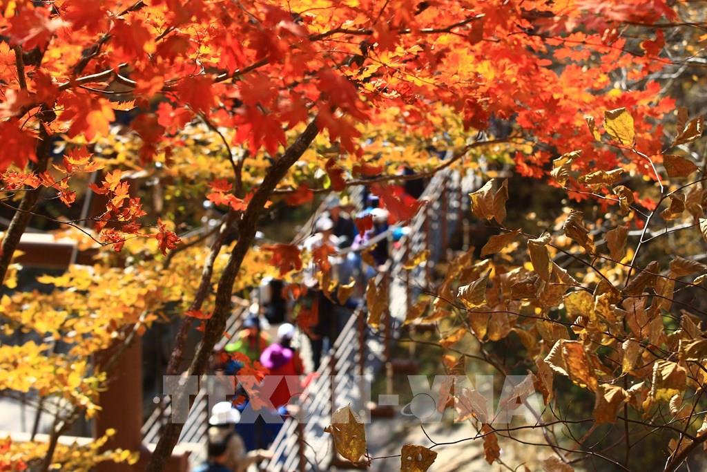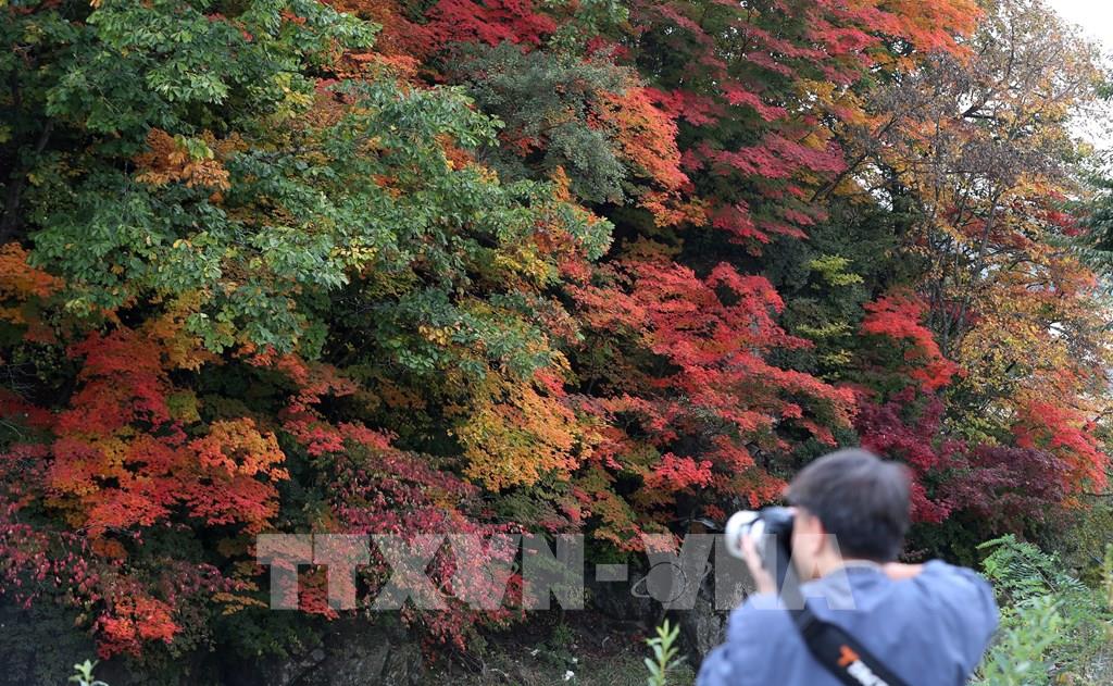 Du khách chụp ảnh lá thu tại tỉnh Gangwon, Hàn Quốc, ngày 2/10/2022. Ảnh: Yonhap/ TTXVN