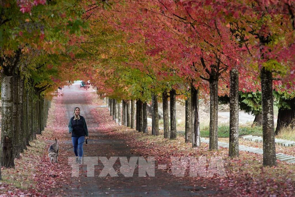 Người dân đi dạo dưới tán lá thu ở Vancouver, Canada, ngày 26/10/2022. Ảnh: THX/ TTXVN
