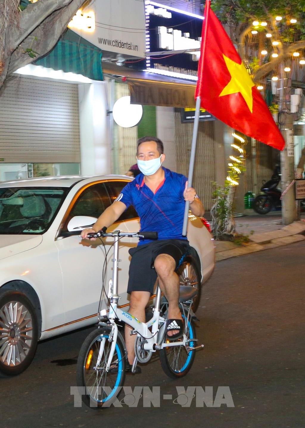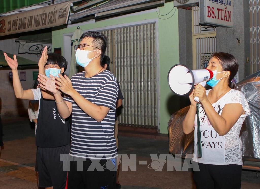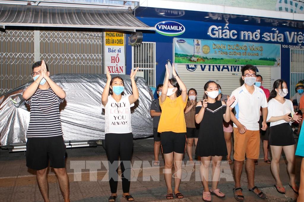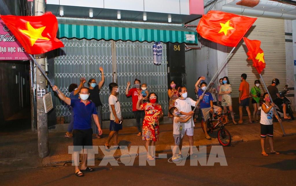 Người dân ở trên tuyến đường Nguyễn Thị Minh Khai vui mừng sau khi hoàn thành cách ly 14 ngày trong khu vực phong tỏa. Ảnh: Trần Lê Lâm - TTXVN