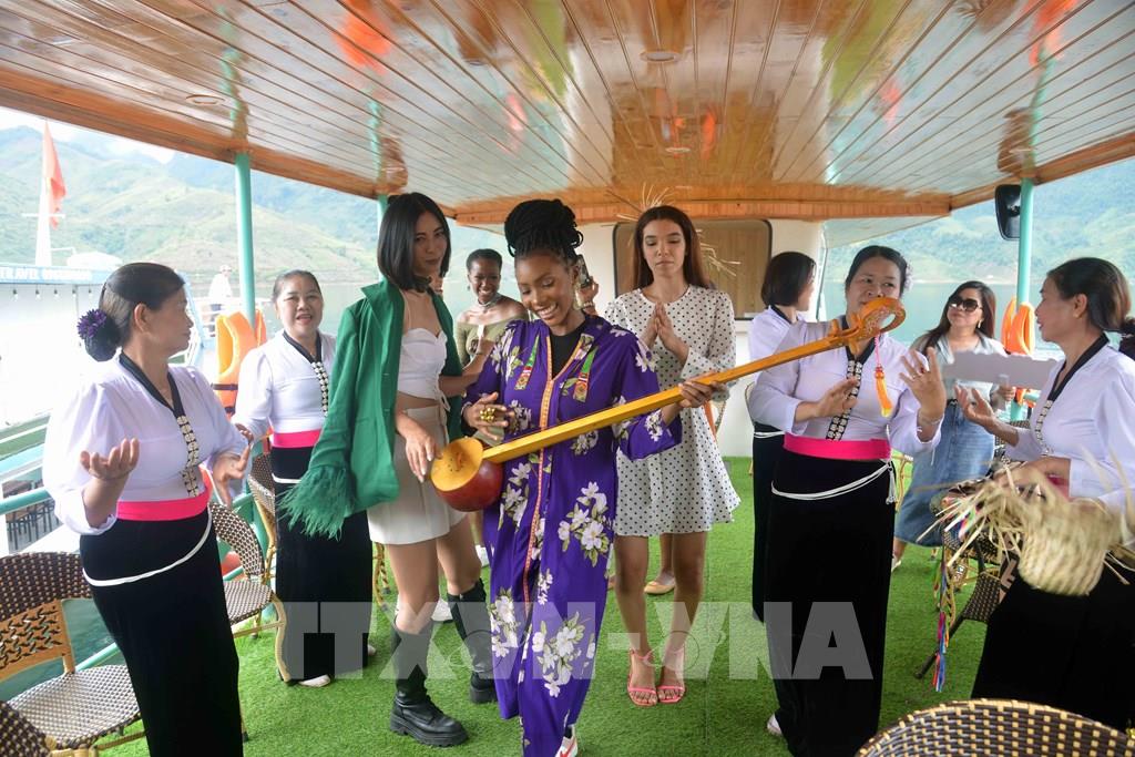 Các thí sinh của Cuộc thi Hoa hậu Du lịch Thế giới 2022 cùng đồng bào dân tộc Thái trải nghiệm du lịch lòng hồ huyện Quỳnh Nhai. Ảnh: Quang Quyết-TTXVN