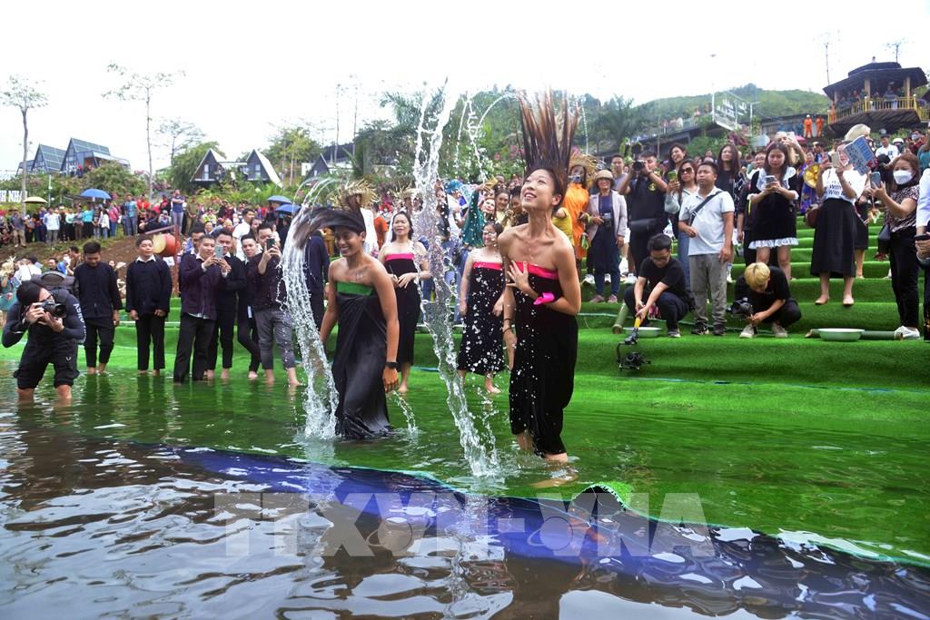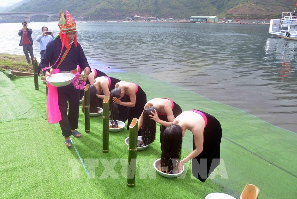 Các thí sinh của Cuộc thi Hoa hậu Du lịch Thế giới 2022 trải nghiệm gội đầu - Nghi lễ của người Thái Trắng, huyện Quỳnh Nhai. Ảnh: Quang Quyết-TTXVN