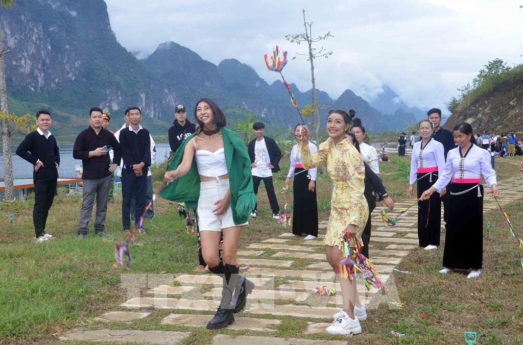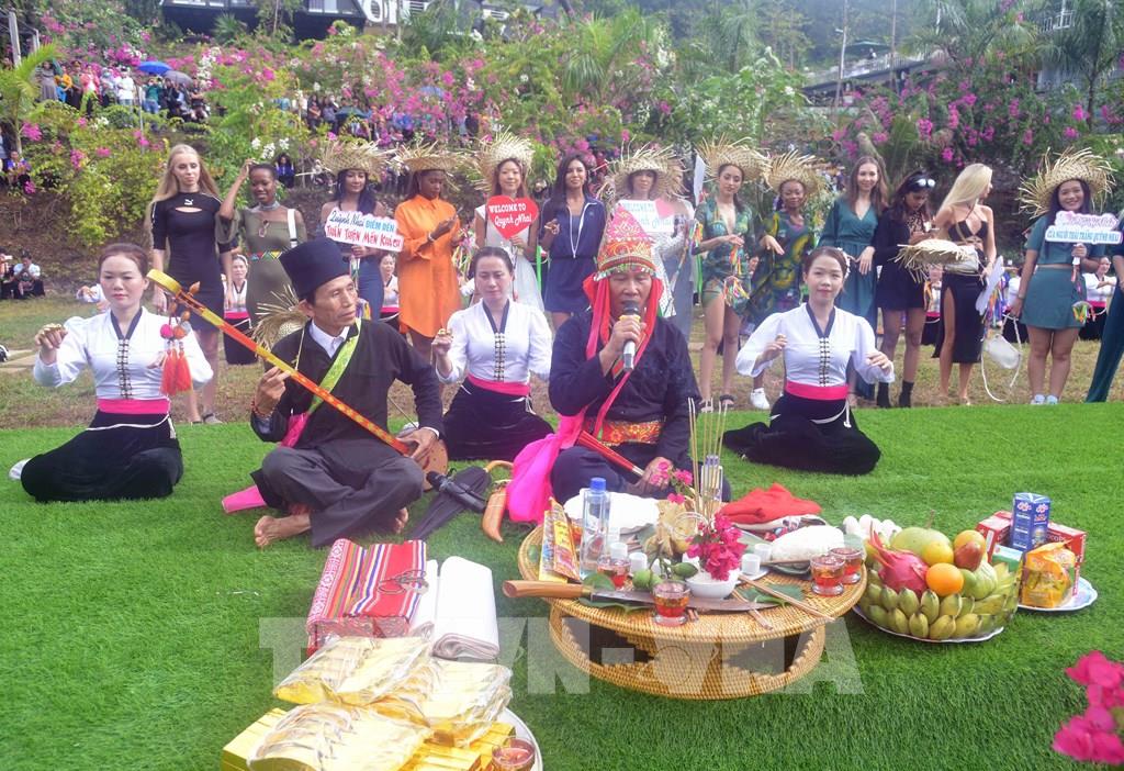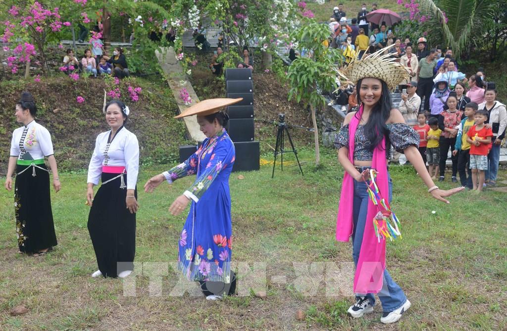 Các thí sinh của Cuộc thi Hoa hậu Du lịch Thế giới 2022 cùng đồng bào dân tộc Thái trong chuyến hành trình trải nghiệm tại huyện Quỳnh Nhai. Ảnh: Quang Quyết-TTXVN