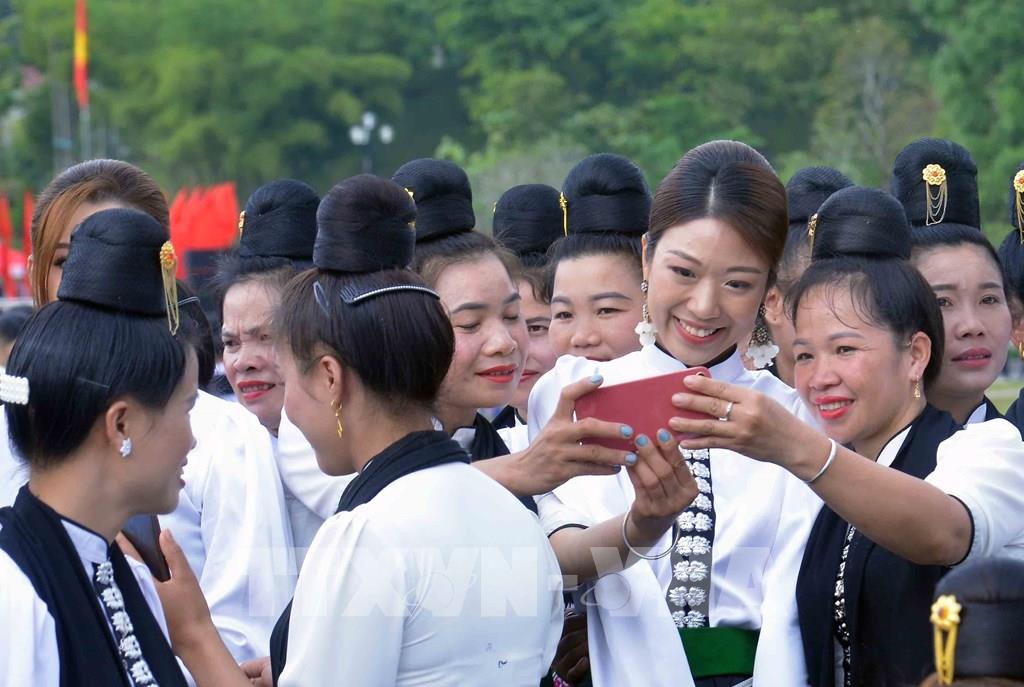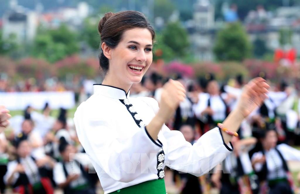 Thí sinh Cuộc thi Hoa hậu Du lịch thế giới năm 2022 chụp ảnh lưu niệm với người dân Sơn La. Ảnh: Quang Quyết-TTXVN