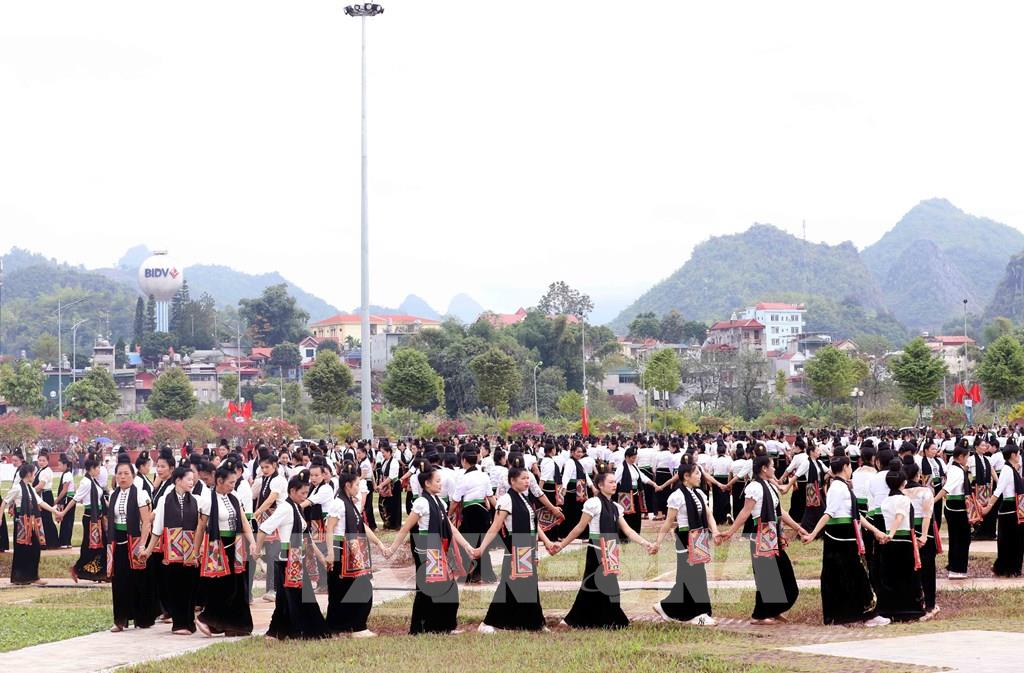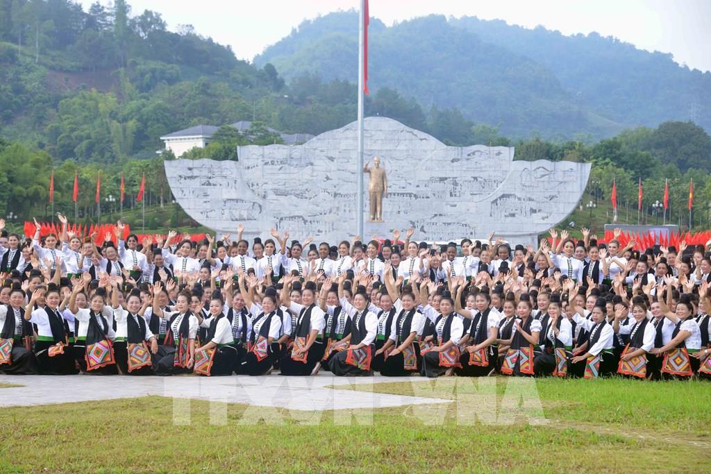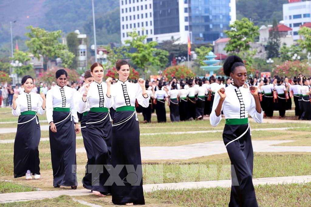 Thí sinh Cuộc thi Hoa hậu Du lịch thế giới năm 2022 tham gia trình diễn, trải nghiệm nghệ thuật xòe Thái cùng khoảng 1.000 người dân địa phương. Ảnh: Quang Quyết-TTXVN