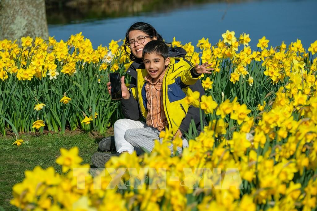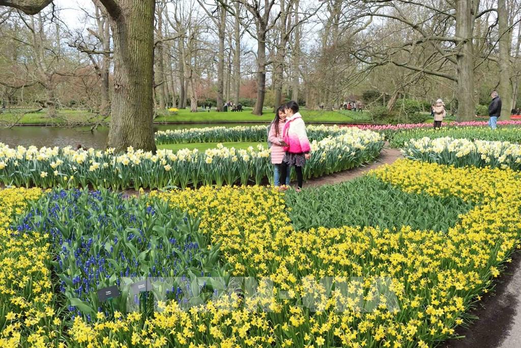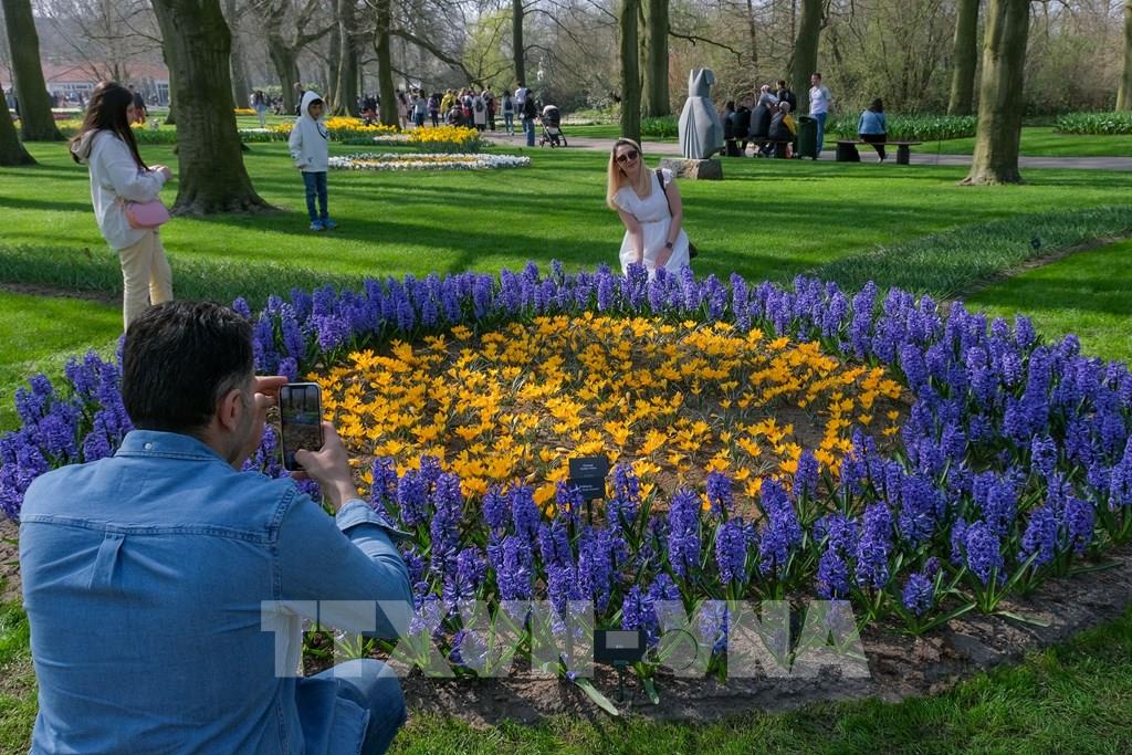 Du khách chụp ảnh lưu niệm tại vườn hoa Keukenhof ở Lisse, Hà Lan, ngày 26/3/2022. Ảnh: THX/ TTXVN
