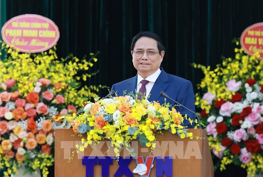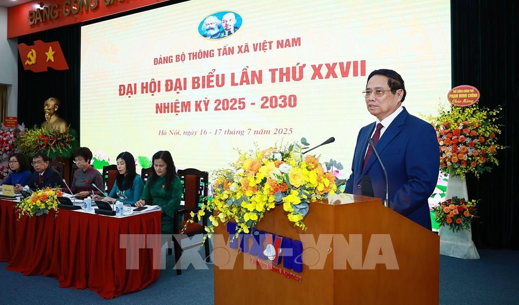 Thủ tướng Chính phủ Phạm Minh Chính phát biểu tại Đại hội Đảng bộ Thông tấn xã Việt Nam lần thứ 27, nhiệm kỳ 2025 - 2030. Ảnh: Dương Giang - TTXVN