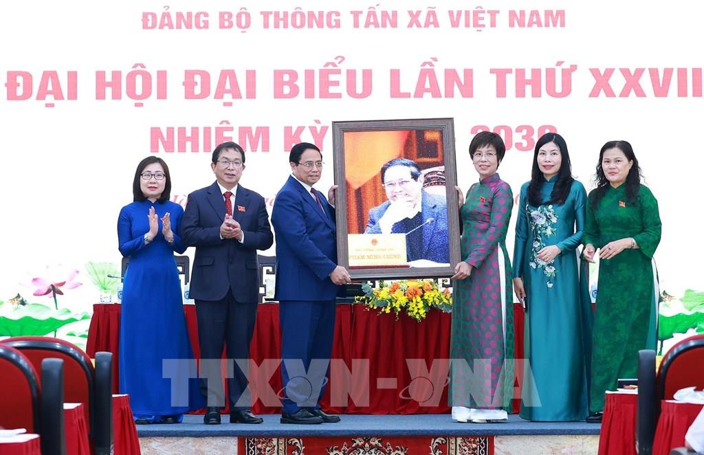 Đồng chí Phạm Minh Chính, Uỷ viên Bộ Chính trị, Bí thư Đảng uỷ Chính phủ, Thủ tướng Chính phủ tặng hoa chúc mừng Ban Chấp hành Đảng bộ Thông tấn xã Việt Nam lần thứ 27, nhiệm kỳ 2025 - 2030.