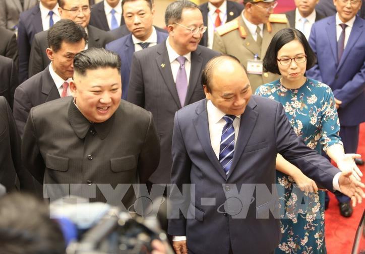 Thủ tướng Nguyễn Xuân Phúc giới thiệu với Chủ tịch Triều Tiên Kim Jong-un những bức ảnh tiêu biểu về quan hệ giữa hai nước trong 69 năm qua, kể từ ngày thiết lập quan hệ ngoại giao 31/1/1950, do các phóng viên ảnh của TTXVN chụp. Ảnh: Dương Giang - TTXVN