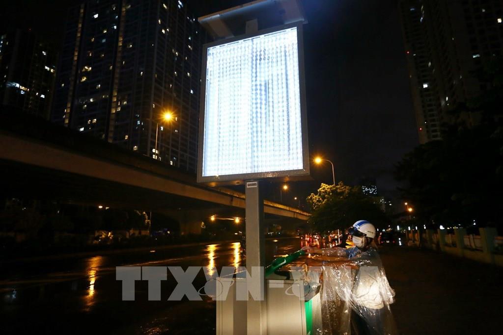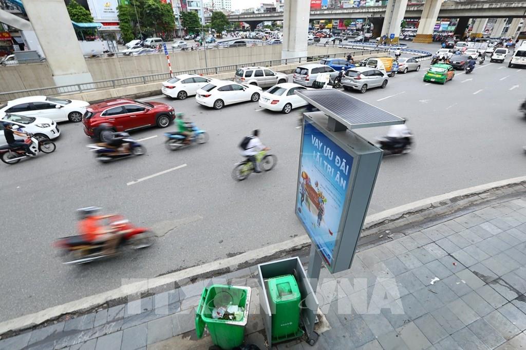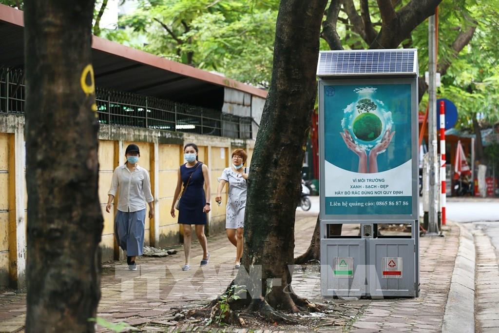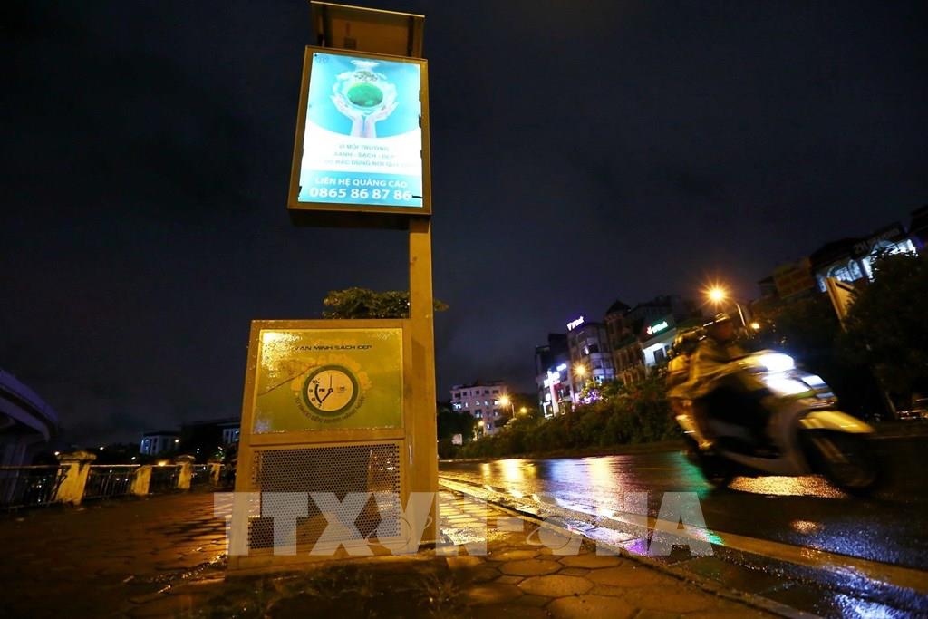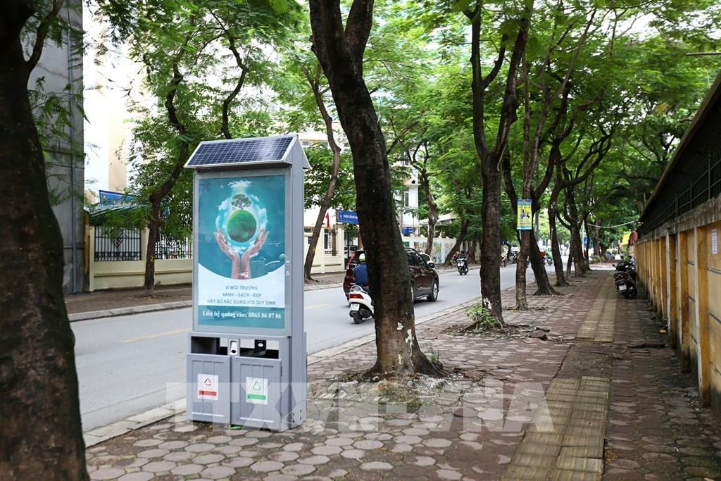 Thùng rác công nghệ, với tấm pin năng lượng mặt trời, tạo nguồn bổ sung ánh sáng cho thành phố về đêm, tuyên truyền bảo vệ môi trường bằng chính năng lượng tái tạo. Ảnh: Minh Quyết – TTXVN