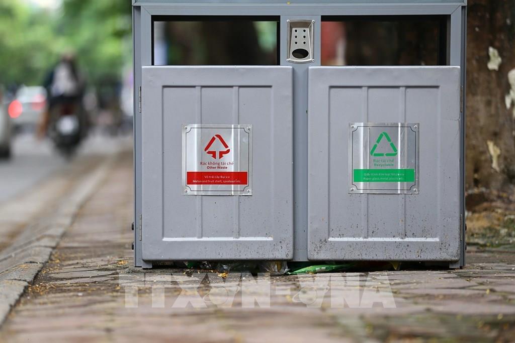Thời gian qua, các thùng rác kiểu mới được lắp đặt trên nhiều tuyến phố của Hà Nội. Ảnh: Minh Quyết - TTXVN