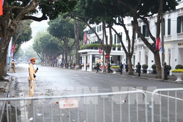 Lực lượng an ninh lập hàng rào phong toả lối vào khu vực cổng chính khách sạn Metropole ngay từ ngã tư Ngô Quyền - Tràng Tiền. Ảnh: Minh Quyết - TTXVN