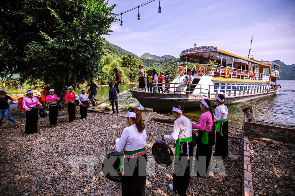 Tàu du lịch đưa du khách ghé thăm và trải nghiệm tại xóm Ké, xã Hiền Lương, Đà Bắc. Ảnh: Trọng Đạt - TTXVN
