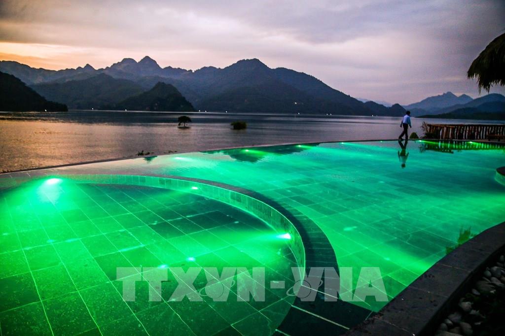 Bể bơi vô cực tại khu nghỉ dưỡng Mai Châu HideAway Resort ngay bên dòng sông Đà thơ mộng. Ảnh: Trọng Đạt - TTXVN