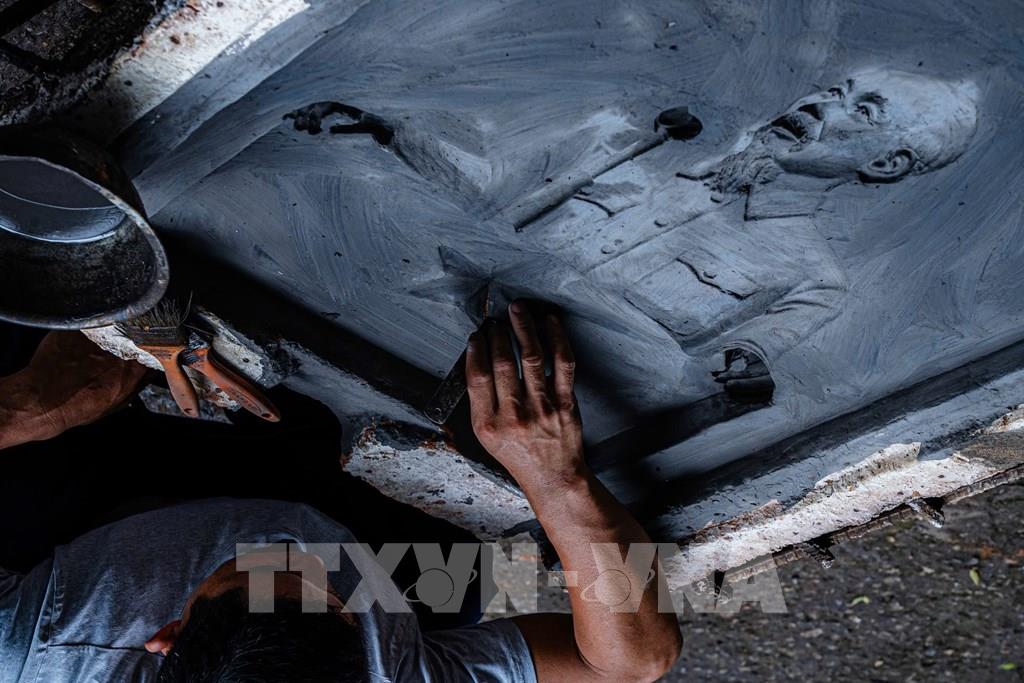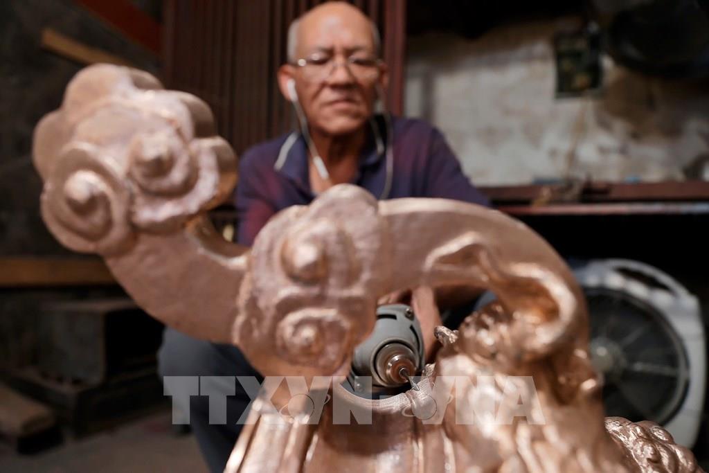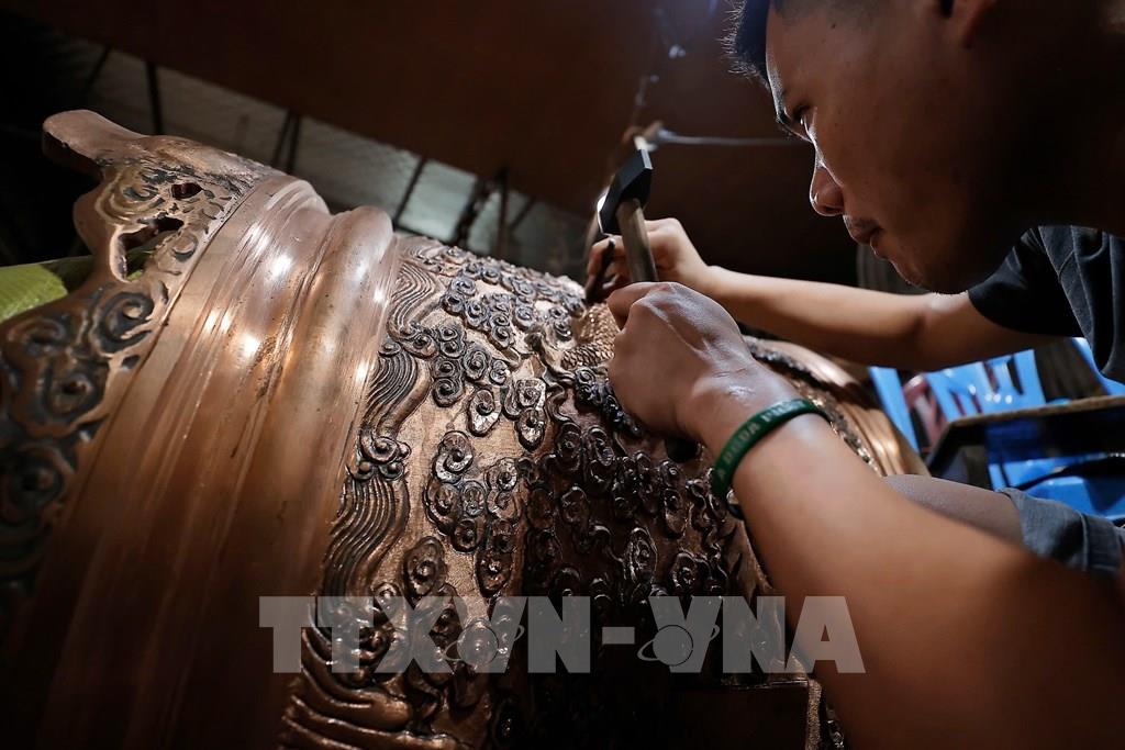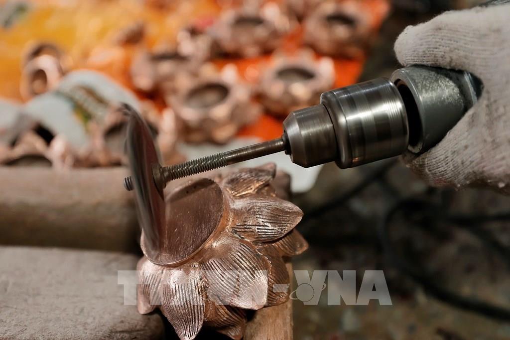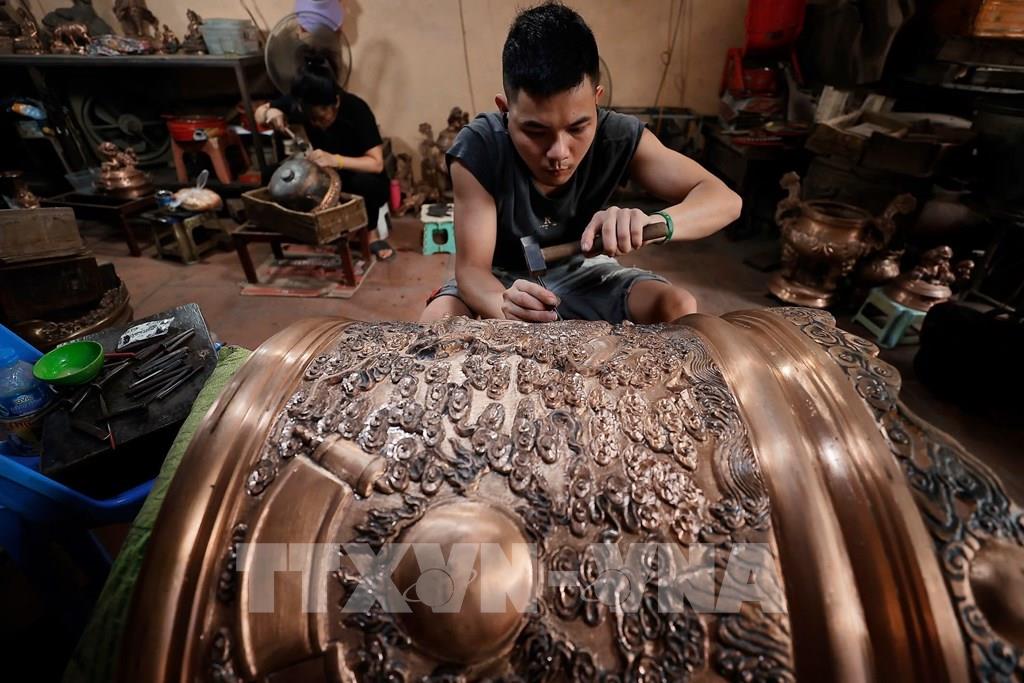 Tỉ mỉ chạm khắc từng đường nét tinh xảo cho sản phẩm đồng đúc. Ảnh: Minh Quyết - TTXVN