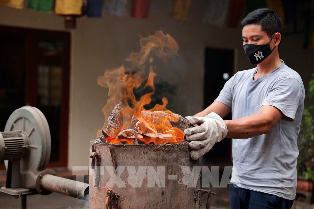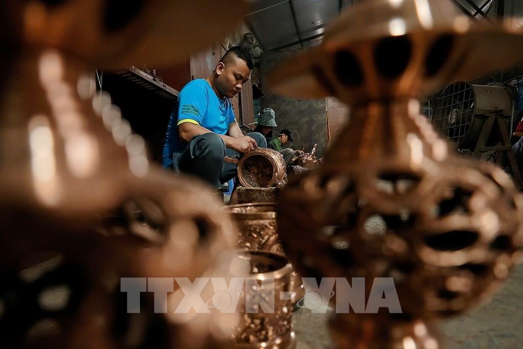 Các công đoạn sản xuất đồng Ngũ Xã đều được làm thủ công, đòi hỏi người thợ phải có tay nghề cao, sản phẩm làm ra mới bảo đảm chất lượng. Ảnh: Minh Quyết - TTXVN