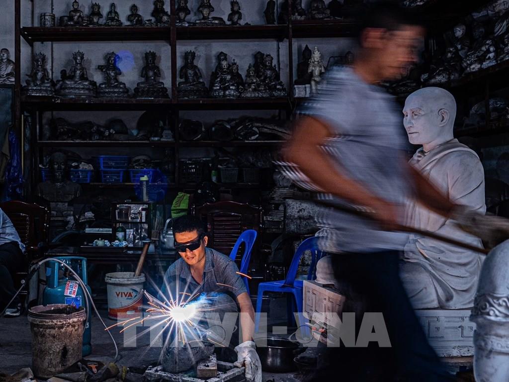 Tới nay, dù nghề đứng trước nguy cơ bị mai một, thế hệ con cháu của dân làng Ngũ Xã vẫn kiên trì học hỏi rèn luyện, kế thừa những tinh hoa của cha ông đã được lưu truyền hơn 400 năm, từ đó, nỗ lực đóng góp những tác phẩm nghệ thuật cho nền văn hóa Việt. Ảnh: Minh Quyết - TTXVN
