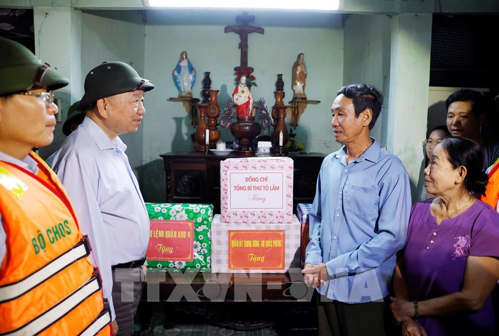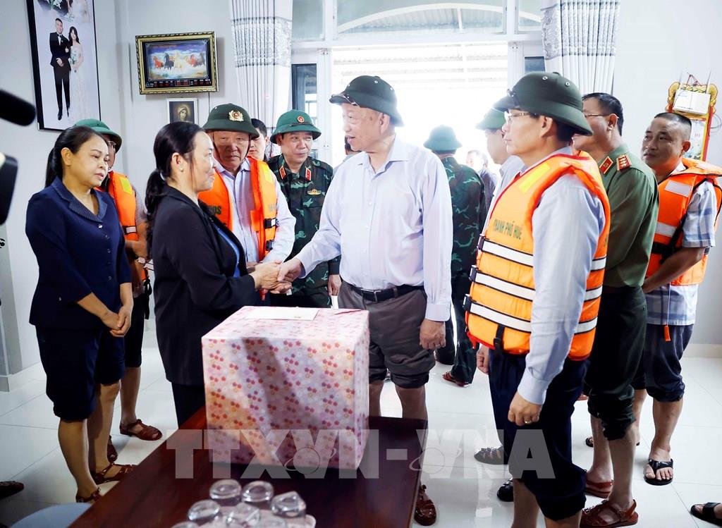 Tổng Bí thư Tô Lâm thăm hỏi và tặng quà cho nhân dân xã Quảng Điền, thành phố Huế. Ảnh: Thống Nhất - TTXVN