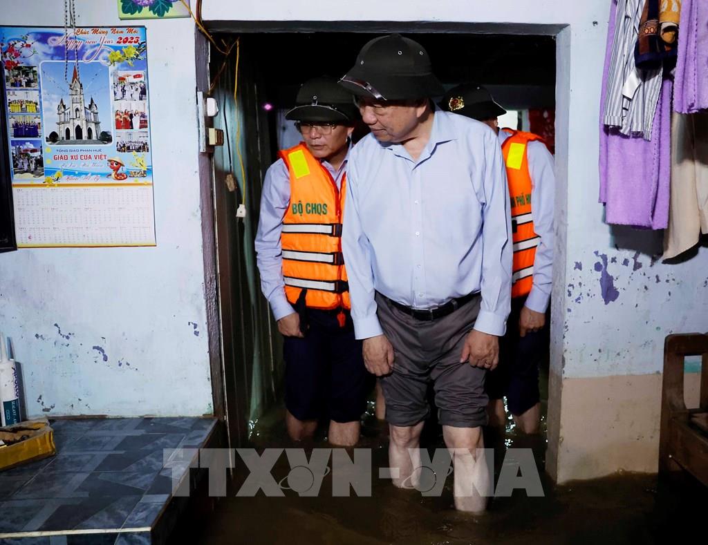 Tổng Bí thư Tô Lâm đến thăm vùng bị chia cắt do mưa lũ tại thôn Khuông Phò Đông, xã Quảng Điền, Thành phố Huế. Ảnh: Thống Nhất – TTXVN