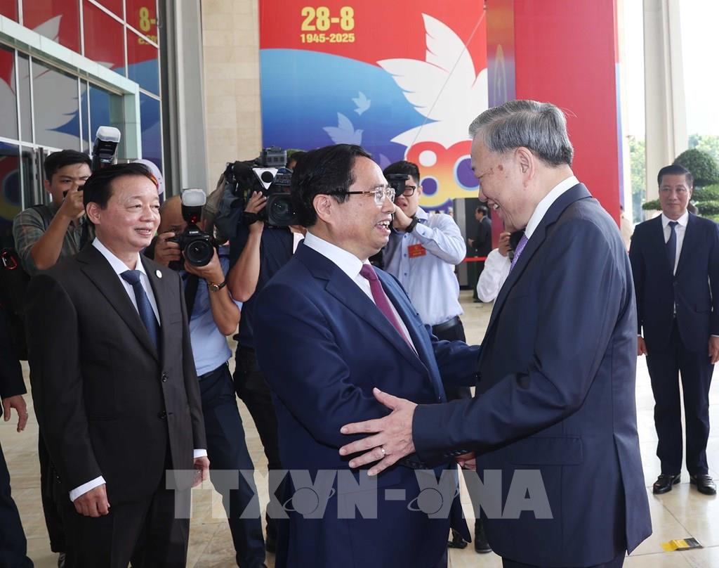 Thủ tướng Phạm Minh Chính đón Tổng Bí thư Tô Lâm đến dự Lễ kỷ niệm 80 năm thành lập Chính phủ . Ảnh: Dương Giang-TTXVN