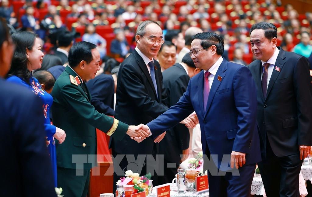 Thủ tướng Phạm Minh Chính với các đại biểu dự Lễ kỷ niệm 80 năm thành lập Chính phủ. Ảnh: Dương Giang-TTXVN