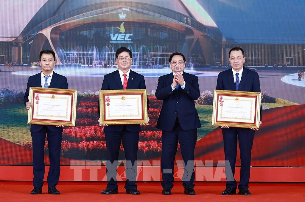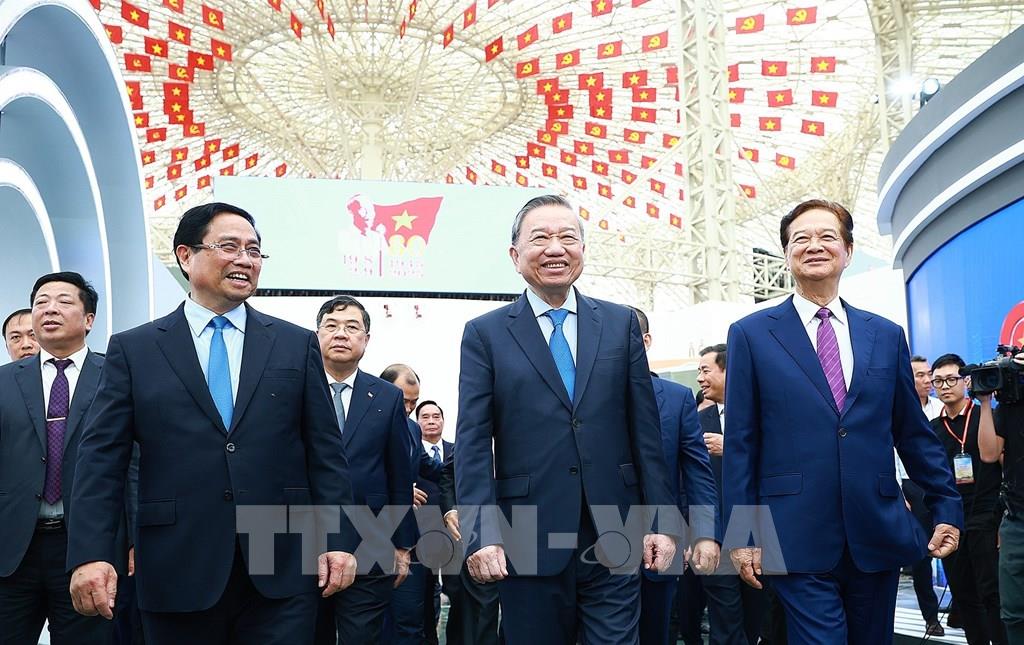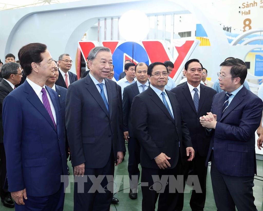 Tổng Bí thư Tô Lâm, Thủ tướng Phạm Minh Chính và các đại biểu tham quan Trung tâm Triển lãm Việt Nam Ảnh: Thống Nhất-TTXVN