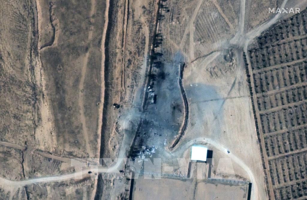 Rạng sáng 26/2/2021, Mỹ đã tiến hành không kích nhằm vào các cơ sở mà Lầu Năm Góc cho là do Iran hậu thuẫn ở miền Đông Syria, giáp giới với Iraq. Tuyên bố của Lầu Năm Góc nêu rõ: "Theo lệnh của Tổng thống Joe Biden, quân đội Mỹ đã tiến hành không kích nhằm đáp trả các vụ tấn công gần đây chống lại quân nhân Mỹ và liên quân tại Iraq, cũng như các mối đe dọa nhằm vào lực lượng này". Trong ảnh (hình ảnh do Hãng công nghệ Maxar thu được từ vệ tình): Những tòa nhà (giữa) bị phá hủy sau vụ không kích của không quân Mỹ xuống khu vực cửa khẩu gần Alm-Qaim, biên giới Syria và Iraq, ngày 26/2/2021. Ảnh: AFP/TTXVN