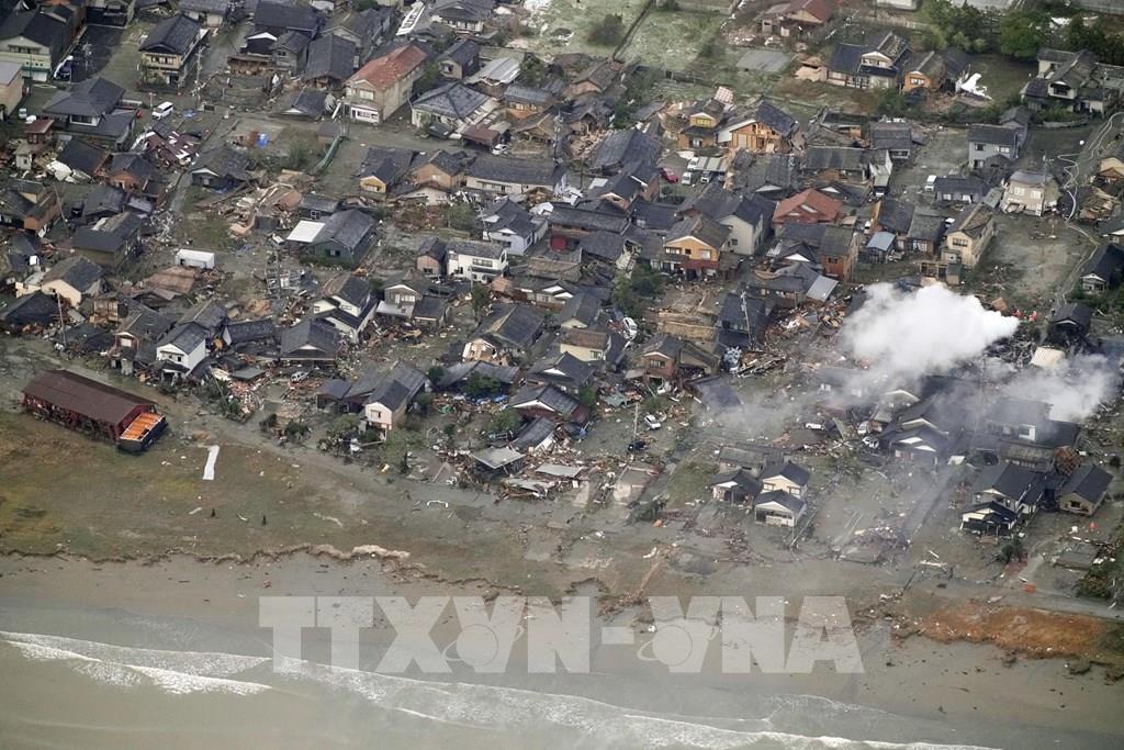 Theo hãng tin Kyodo, nhà chức trách Nhật Bản xác nhận ít nhất 78 người đã thiệt mạng, ít nhất 330 người bị thương trong trận động đất có độ lớn 7,6 xảy ra chiều 1/1/2024 ở tỉnh Ishikawa, miền Trung nước này. Trận động đất đã gây ra sóng thần và hỏa hoạn, nhiều nhà cửa và đường sá bị hư hại. Chính phủ đã huy động hàng nghìn binh sĩ và lực lượng cứu hộ chạy đua với thời gian để tìm kiếm các nạn nhân và khắc phục thiệt hại. Ảnh: Cảnh tàn phá tại khu vực ven biển ở Suzu, tỉnh Ishikawa sau động đất. Kyodo/TTXVN