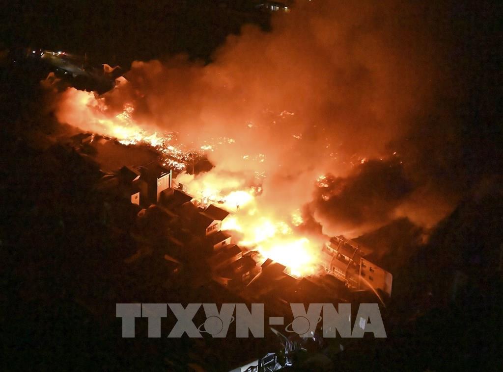 Theo hãng tin Kyodo, nhà chức trách Nhật Bản xác nhận ít nhất 78 người đã thiệt mạng, ít nhất 330 người bị thương trong trận động đất có độ lớn 7,6 xảy ra chiều 1/1/2024 ở tỉnh Ishikawa, miền Trung nước này. Trận động đất đã gây ra sóng thần và hỏa hoạn, nhiều nhà cửa và đường sá bị hư hại. Chính phủ đã huy động hàng nghìn binh sĩ và lực lượng cứu hộ chạy đua với thời gian để tìm kiếm các nạn nhân và khắc phục thiệt hại. Ảnh: Lửa cháy dữ dội tại thành phố Wajima, tỉnh Ishikawa sau động đất. KYODO/TTXVN