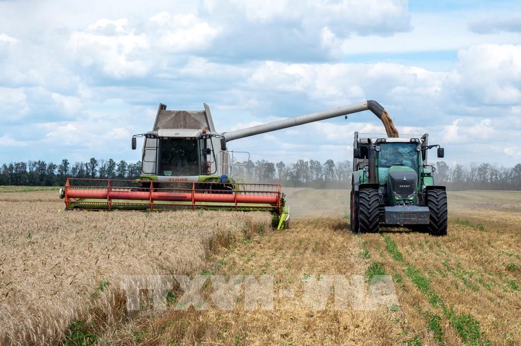 Theo hãng tin TASS, ngày 2/5/2023, Ủy ban châu Âu (EC) chính thức cấm Ukraine xuất khẩu ngũ cốc sang 5 nước châu Âu gồm Bulgaria, Hungary, Ba Lan, Romania và Slovakia, nhưng vẫn cho phép Kiev trung chuyển và xuất khẩu ngũ cốc sang các nước thành viên Liên minh châu Âu (EU) khác. Lệnh cấm có hiệu lực từ ngày 2/5 đến ngày 5/6. Ảnh: Nông dân thu hoạch ngũ cốc tại Kharkiv, Ukraine. Ảnh: AFP/TTXVN