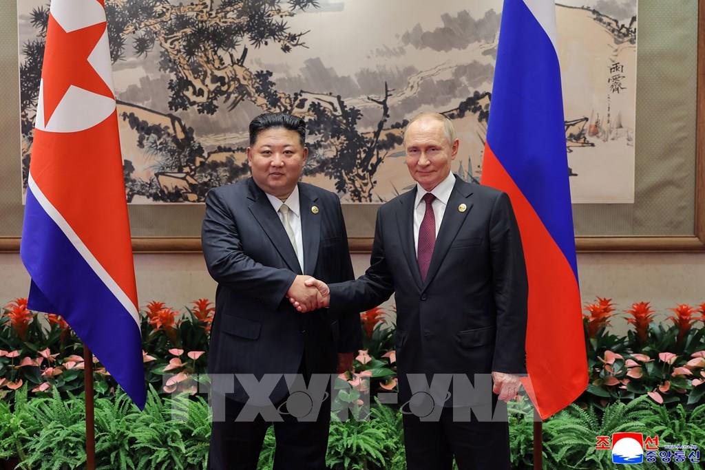 Ngày 3/9/2025, Tổng thống Nga Vladimir Putin (phải) và nhà lãnh đạo Triều Tiên Kim Jong Un (trái) tiến hành cuộc gặp song phương tại thủ đô Bắc Kinh của Trung Quốc, sau khi tham dự lễ kỷ niệm 80 năm Chiến thắng phát xít. Tổng thống Putin khẳng định tại cuộc gặp với nhà lãnh đạo Kim Jong Un rằng mối quan hệ giữa Nga và Triều Tiên đang phát triển theo một cách thức đặc biệt. Về phần mình, nhà lãnh đạo Kim Jong Un cho biết mối quan hệ giữa hai nước đang phát triển trên tất cả các lĩnh vực, đồng thời khẳng định sẽ tiếp tục củng cố quan hệ song phương với Nga. Ảnh: Yonhap/TTXVN