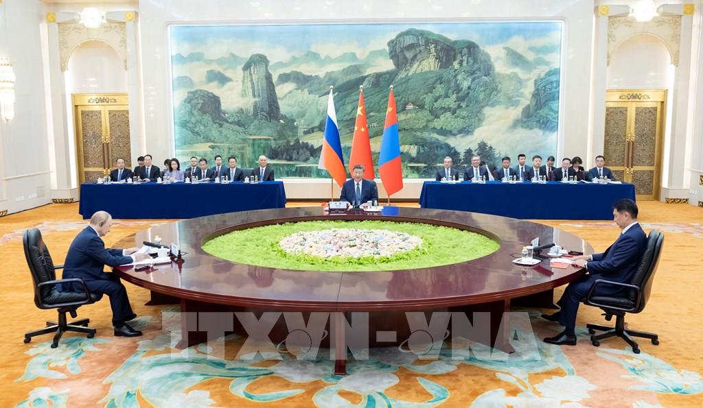 Ngày 2/9/2025, Chủ tịch Trung Quốc Tập Cận Bình, Tổng thống Nga Vladimir Putin và Tổng thống Mông Cổ Ukhnaa Khurelsukh có cuộc gặp tại Đại lễ đường Nhân dân ở thủ đô Bắc Kinh. Tổng thống Nga Putin khẳng định Nga sẵn sàng hợp tác chiến lược bình đẳng, cùng có lợi và hướng tới tương lai với Trung Quốc và Mông Cổ, để hợp tác ba bên có thể bổ sung và củng cố hợp tác song phương. Về phần mình, Chủ tịch Trung Quốc Tập Cận Bình đưa ra ba đề xuất thúc đẩy hợp tác Trung Quốc-Nga-Mông Cổ, bao gồm tăng cường lòng tin chính trị lẫn nhau, đi sâu hợp tác cùng có lợi, hợp tác chặt chẽ trong khuôn khổ Tổ chức Hợp tác Thượng Hải (SCO)… Ảnh: THX/TTXVN